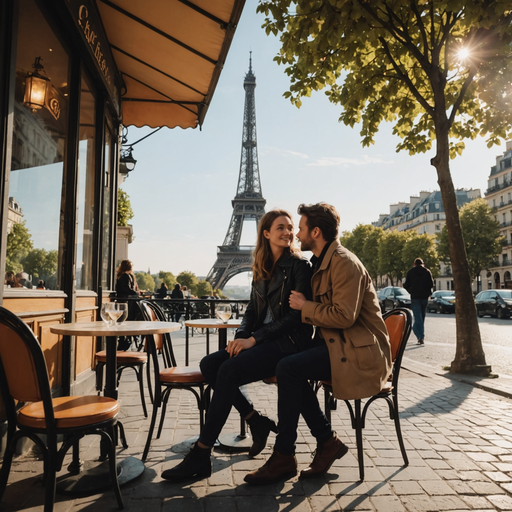 A couple enjoys a cozy moment at a Parisian cafe, with the iconic Eiffel Tower providing a breathtaking backdrop. The sun shines brightly, creating a romantic and picturesque scene.