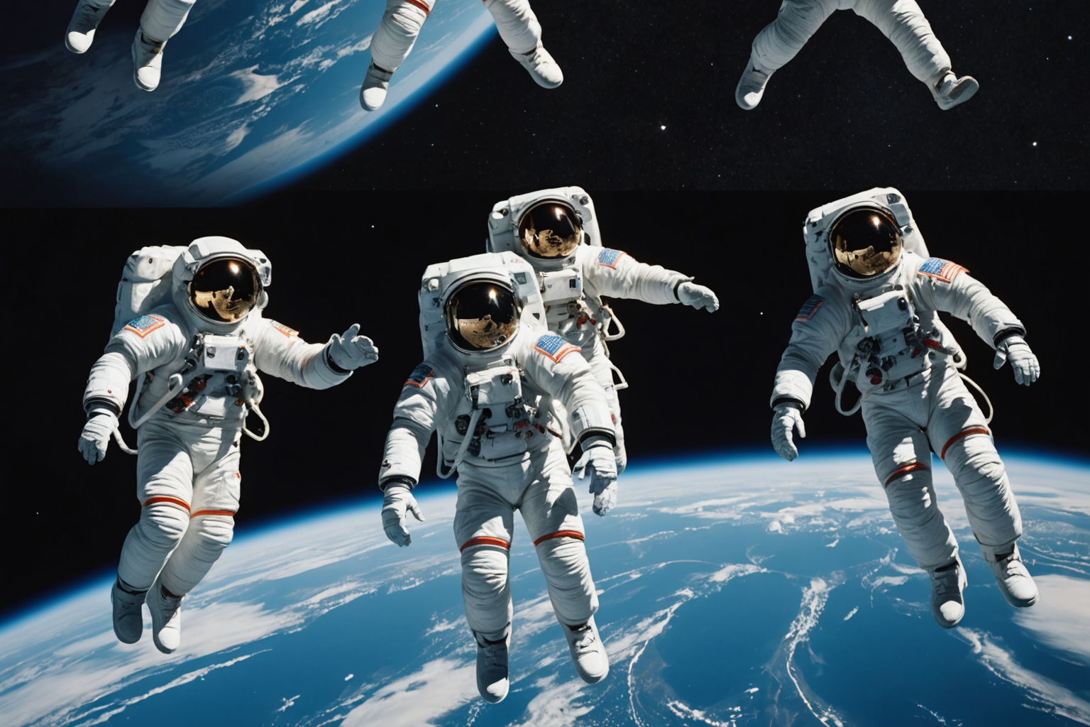 A breathtaking image captures the wonder and isolation of space exploration. Multiple astronauts float weightlessly against the backdrop of Earth, their poses creating a sense of both awe and solitude. The vastness of space is palpable, leaving viewers with a profound sense of the universe’s immensity.