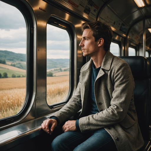 A man, lost in thought, gazes out the train window at a passing landscape. His pensive expression evokes a sense of longing and contemplation, capturing the essence of a journey both physical and internal.