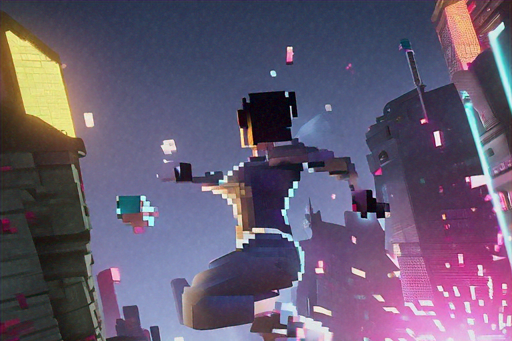 Witness a dynamic scene of a female character soaring through a vibrant, pixelated cityscape. Glowing lights illuminate the futuristic landscape, while a vibrant pink explosion adds a burst of energy and excitement to the scene. This artwork captures the essence of action and dynamism, leaving you breathless with its futuristic energy.