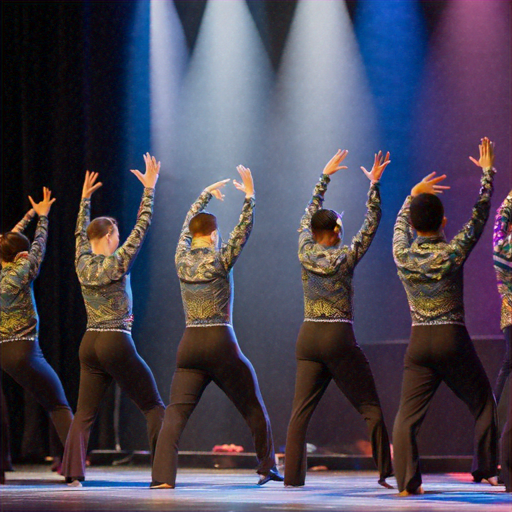 A group of dancers in matching outfits command the stage with their energetic performance, illuminated by colorful spotlights against a dark backdrop. The dramatic lighting and powerful movements create a captivating and mysterious atmosphere.