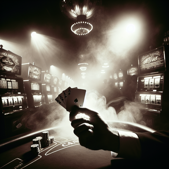 Film noir: Intense, suspenseful, dangerous ; A gambler’s hand holding a pair of aces; close-up; Gaming; A smoky, dimly lit casino with flashing lights and the sound of slot machines.; cinematic