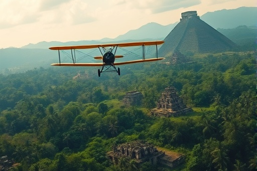 A small plane soars above a vibrant green jungle, hinting at adventure and exploration. In the distance, a towering pyramid-like structure emerges, shrouded in mystery and beckoning the intrepid traveler.