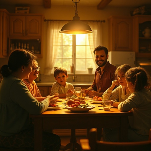 style-aesthetic Impressionist: Intimate, heartwarming ; A family gathered around a table, sharing a meal, with warm, golden light illuminating their faces; medium shot; Family; A cozy kitchen with a warm, inviting atmosphere; cinematic