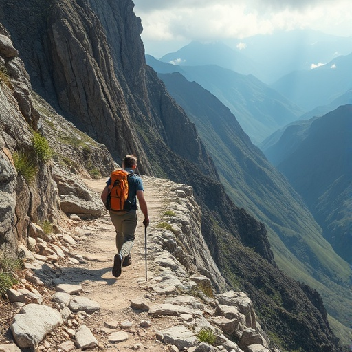 A lone figure traverses a narrow path on a cliff edge, dwarfed by the grandeur of the surrounding mountains. The scene evokes a sense of serenity, adventure, and isolation, highlighting the potential danger of the hiker’s journey.