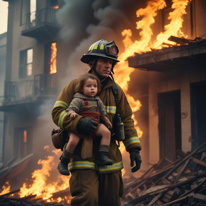 A firefighter, unwavering in the face of danger, carries a young child to safety from a burning building. The scene is a stark contrast of heroism and devastation, capturing the intensity and drama of the moment.