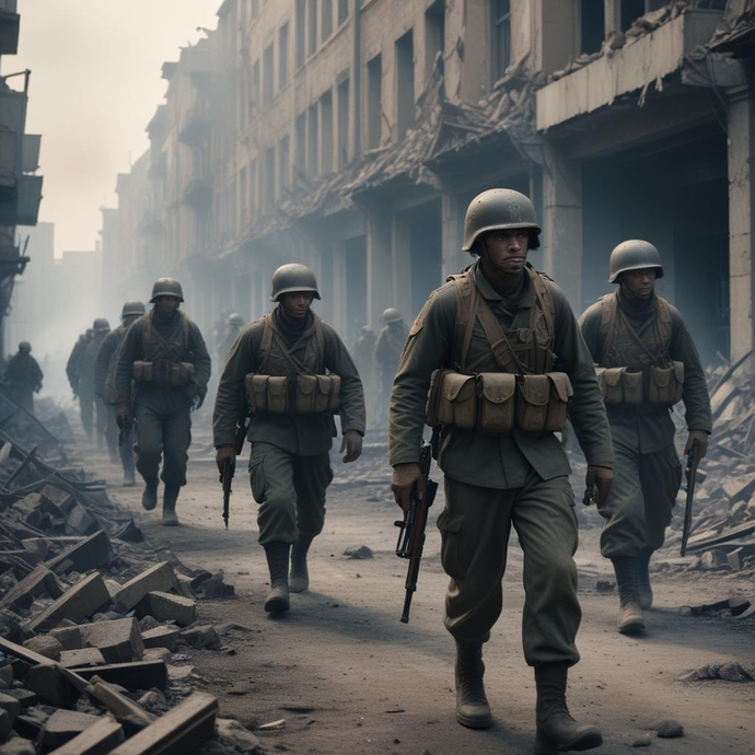 Vintage: Grim, heroic, determined ; A group of soldiers marching through a war-torn city; medium shot; Heroism; a desolate cityscape with rubble and smoke; cinematic