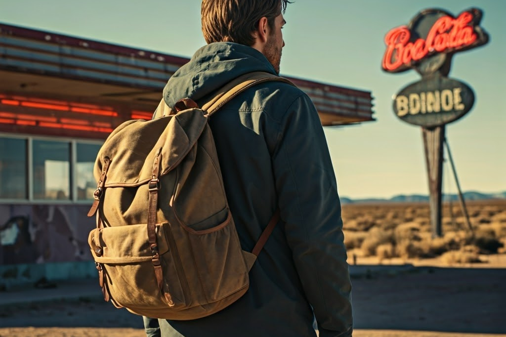 A lone man, burdened by a backpack, stands before a forgotten diner, its Coca-Cola sign a faded echo of a bygone era. The desolate setting whispers of solitude and melancholy, leaving a lingering sense of mystery in the air. The stark contrast between the man’s presence and the empty diner amplifies the feeling of isolation, inviting contemplation on the weight of loneliness and the passage of time.