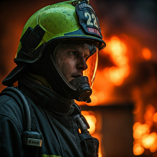 A powerful image captures the intensity of a firefighter’s duty. Standing before a burning building, the flames blurred in the background, the firefighter’s calm gaze speaks volumes about their bravery and dedication. The contrast between the controlled presence and the raging fire creates a dramatic and impactful scene.