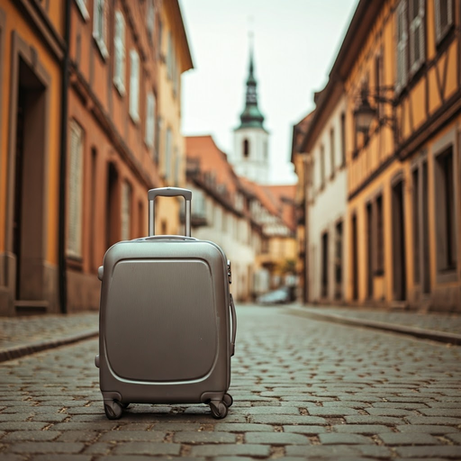 style-aesthetic Minimalist: Nostalgic, hopeful ; A lone suitcase on a cobblestone street; medium shot; Tourism; A quaint, European town in the background; cinematic