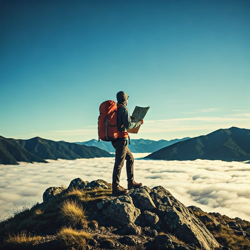 style-aesthetic Pop art: Free, adventurous ; A backpacker, with a map in hand, standing on a mountain peak; wide shot; Travel; breathtaking mountain range with clouds swirling below; cinematic