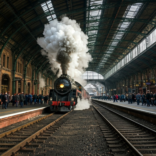 A powerful steam train emerges from a bustling station, its billowing smoke painting the sky. Passengers wait on the platform, their anticipation adding a human touch to this dramatic and nostalgic scene.