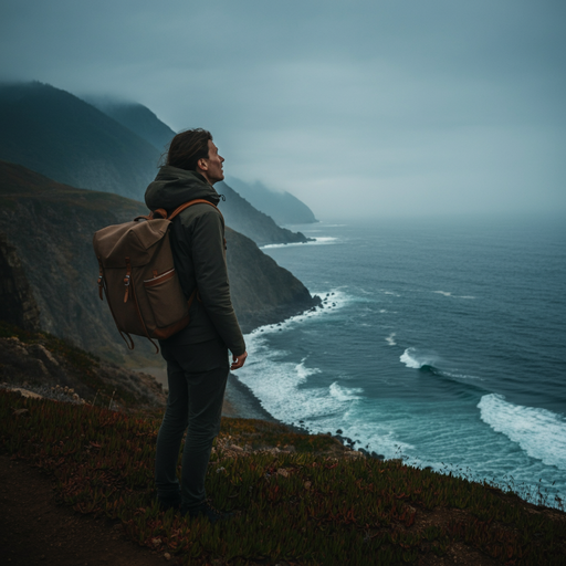A solitary figure stands on a windswept cliff, dwarfed by the dramatic expanse of the ocean. The scene evokes a sense of serenity and adventure, with the hiker’s small form contrasting against the vastness of the landscape. The cloudy sky and rough water add to the mood of contemplation and the dramatic scale of the scene.