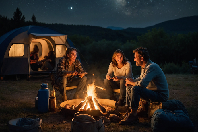 A warm and inviting scene of three friends gathered around a crackling campfire, bathed in the glow of the flames against the backdrop of a star-filled night. The tent in the distance suggests a night of adventure and relaxation under the open sky.