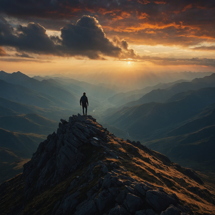 Naturalistic: Epic, triumphant ; A lone figure, silhouetted against the setting sun, standing atop a mountain peak; wide shot; Heroism; Majestic mountain range with clouds swirling around the peak; cinematic