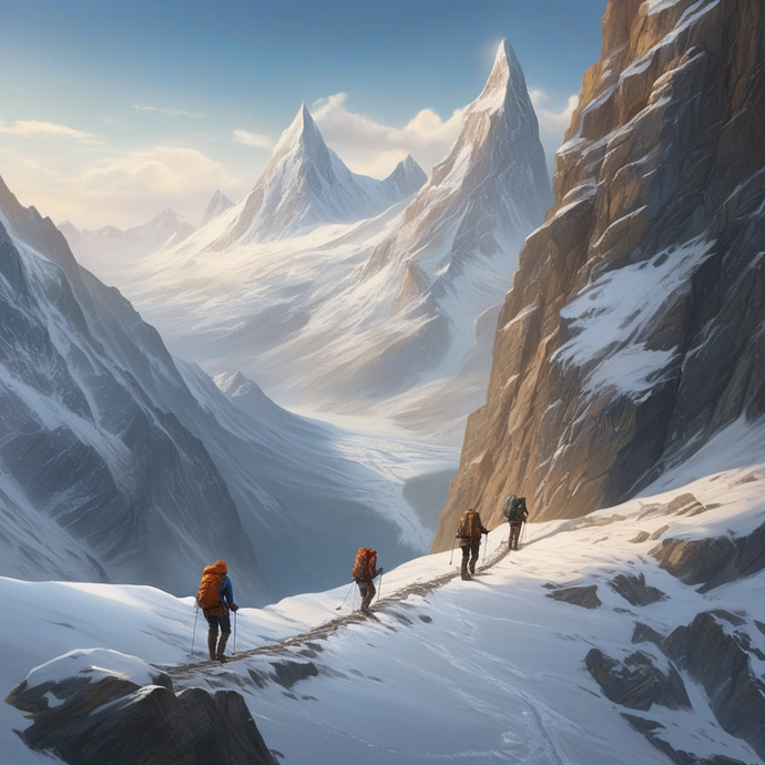 Hyper-realistic: Thrilling, dangerous ; A group of adventurers, navigating a treacherous mountain path, ropes and ice axes in hand; medium shot; Adventure; A rugged, snow-covered mountain range with steep cliffs and icy crevasses; cinematic