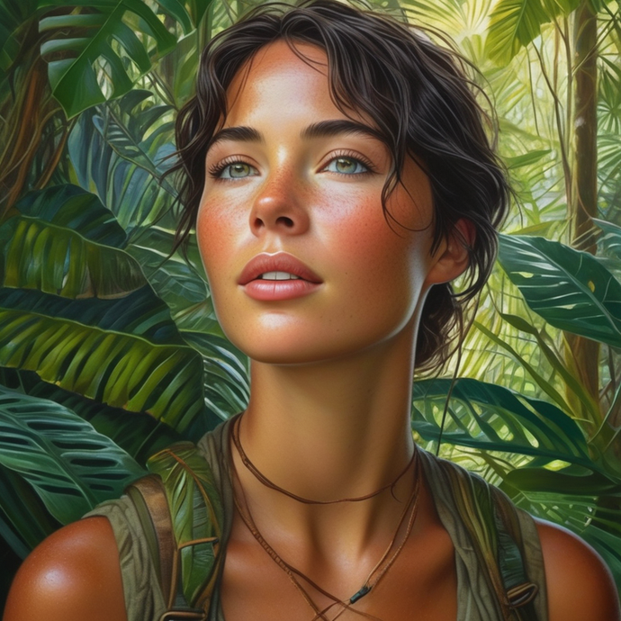 A young adventurer stands amidst the vibrant greenery of a lush jungle, her gaze directed upwards towards the canopy. The warm light filtering through the leaves creates a halo effect around her head, hinting at a sense of mystery and hope. Her worn leather necklace and backpack suggest a journey of discovery, leaving the viewer to wonder what secrets lie ahead.