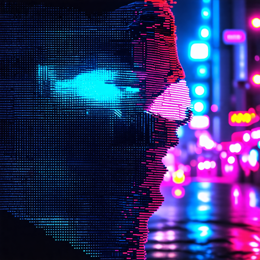 A digital face, rendered in pixelated lines, stands out against a backdrop of vibrant neon lights, creating a futuristic and abstract cyberpunk aesthetic. The stark contrast between the digital and the real evokes a sense of anonymity and the blurring lines between technology and humanity.