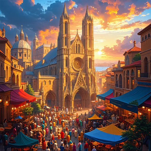 Experience the vibrant energy of a bustling medieval marketplace bathed in the warm glow of sunset. A grand cathedral dominates the scene, its towering presence adding a sense of grandeur and history. The lively crowd, the tilted perspective, and the dramatic lighting create a captivating image that transports you to another time and place.