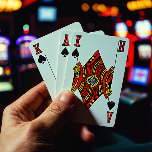 A close-up shot of a hand holding three cards - King, Ace, and Jack of spades - captures the thrill of the game. The blurry background of slot machines adds to the suspense, leaving you wondering what fate holds for this player.
