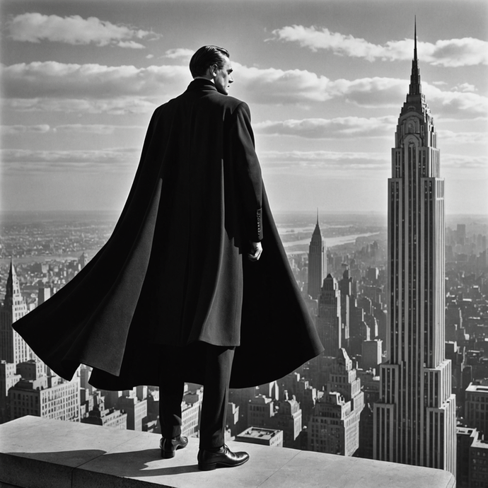 A solitary figure in a long coat stands on a rooftop, his silhouette stark against the cityscape. The Empire State Building looms in the background, adding to the sense of grandeur and mystery. This evocative image captures a moment of isolation and power, tinged with nostalgia.