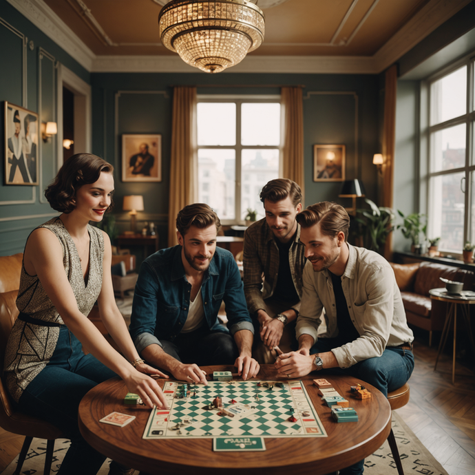 Capture the warmth and playful energy of a night in with friends. This well-furnished living room, complete with a vintage aesthetic, sets the stage for a relaxed and sophisticated evening of board games. The balanced composition creates a sense of intimacy and fun, making this image perfect for evoking feelings of friendship and good times.