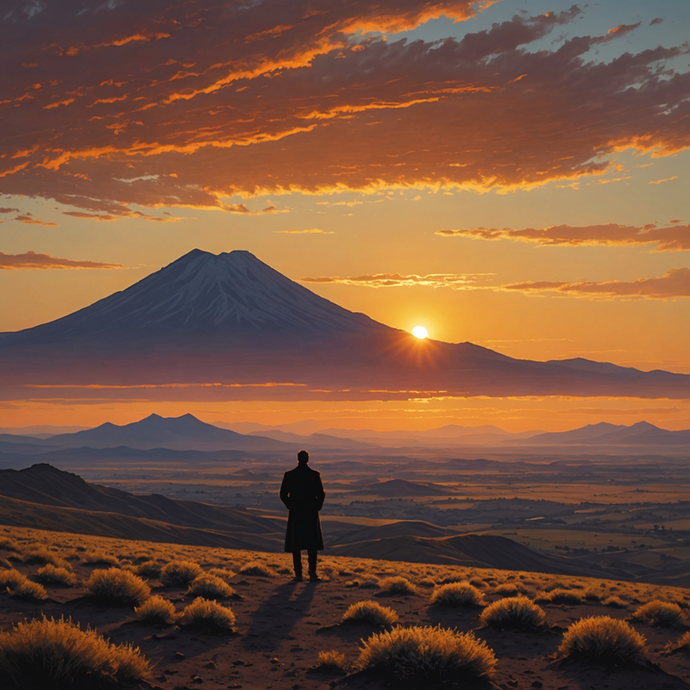 A lone figure stands on a hilltop, bathed in the warm glow of the setting sun. The vast landscape stretches out before them, creating a sense of awe and serenity. The dramatic silhouette against the sunset evokes a feeling of isolation and contemplation, making this a truly captivating image.