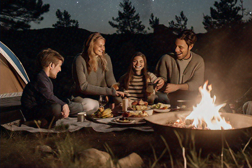 A heartwarming scene of friends and family gathered around a crackling campfire, bathed in the glow of a starlit sky. The warmth of the fire and the intimacy of the group create a cozy and adventurous atmosphere, perfect for an unforgettable camping trip.