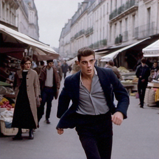 French New Wave: urgent, dramatic ; A young man, his face etched with determination, running through a crowded marketplace; medium shot; heroism; a chaotic, bustling market; cinematic