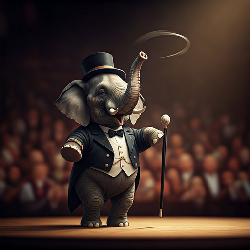 A dapper elephant in a top hat and suit takes center stage, captivating the audience with his whimsical tap dancing routine. Illuminated by a single spotlight, the elephant’s performance is both humorous and charming, creating a dramatic and unforgettable moment.